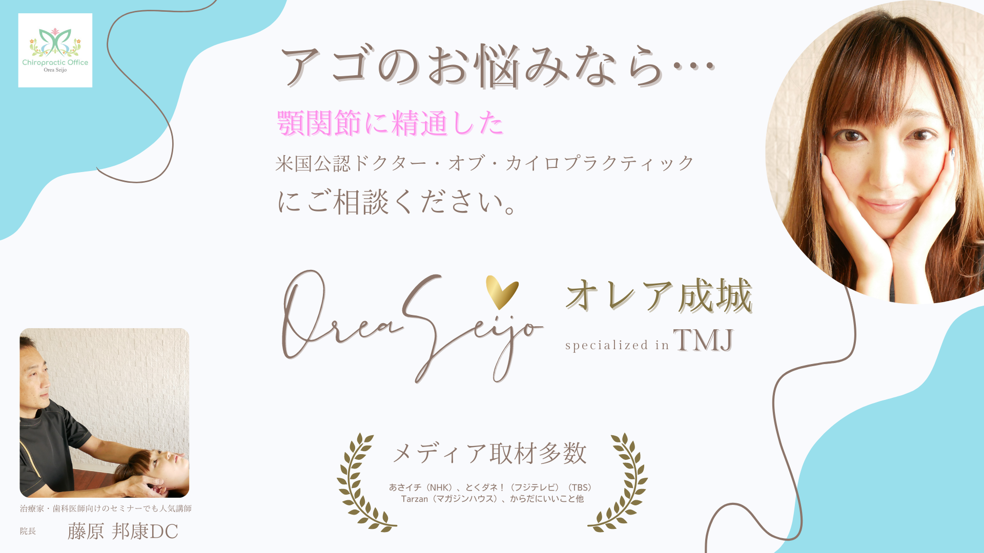 アゴのお悩み、肩こり、腰痛、四十肩、テニス肘・ゴルフ肘、手の痛み・しびれ、股関節痛、膝痛、足痛など米国公認ドクターにご相談ください。五輪選手や芸能人も来院。NHKなど取材多数。歯を食いしばって頑張っている人に笑顔を。